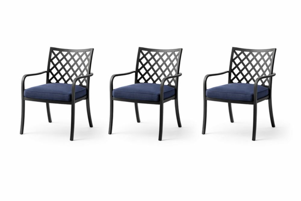 Set of 3 Black Aluminum Frame Outdoor Armchairs with Navy Cushions